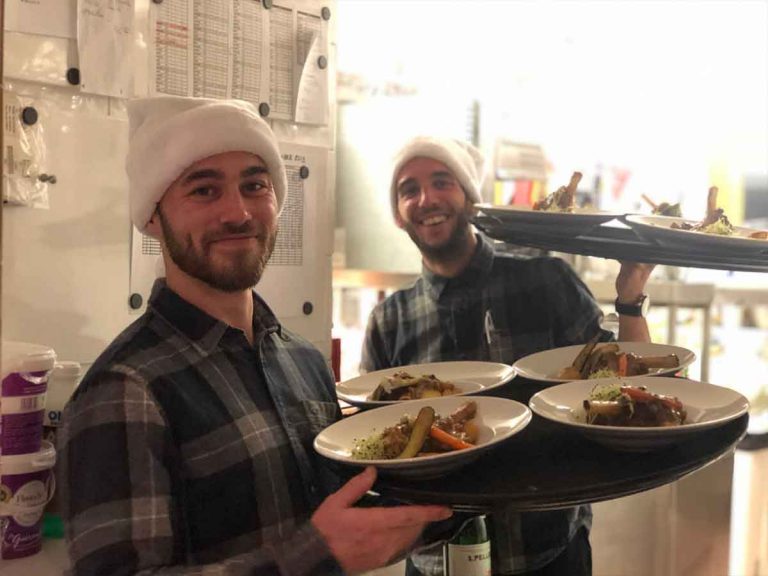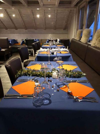 Départ rond point des pistes (accès navettes, taxis, parking voiture) – plat végétarien – animation musicale selon les soirées.